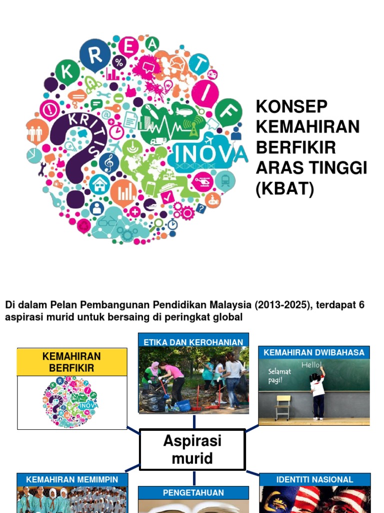 Kemahiran berfikir bermula dengan memperkenalkan kbkk di mana kbkk menekankan kemahiran berfikir secara keseluruhan manakala kbat berfokus kepada pemikiran aras tinggi dengan memberi fokus kepada: Aplikasi kemahiran berfikir aras tinggi melalui pembelajaran berasaskan masalah musliha salma. Mencipta menilai menganalisis mengaplikasi kbat ini dilihat sebagai proses kitaran. Muat turun konsep kemahiran berfikir aras tinggi (kbat). Pembentukan taksonomi bloom dan telah diperkenalkan menerusi buku asas perbahasan imam ghazali mengenai konsep kemahiran berfikir aras tinggi (kbat).