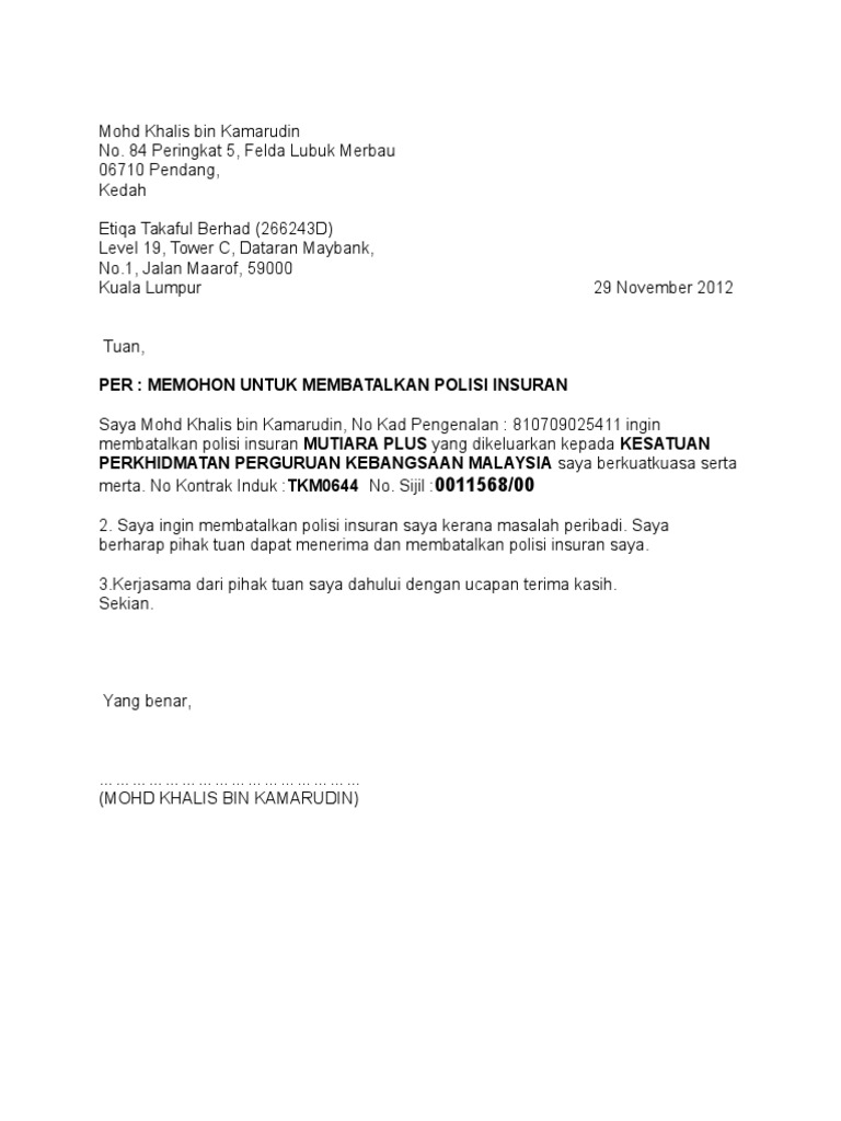 Related posts to contoh surat rasmi pembatalan insurans contoh surat rasmi pembatalan insurans 2017 11 25t19 51 00 08 00 rating. Silahkan anda simak informasi yang sudah kami rangkum lengkap. Cara pembatalan polisi insurans dan contoh surat pembatalan insurans. 2 cara untuk membatalkan polisi takaful atau insurans dan contoh surat pembatalan insurans. Jenis insurans ini biasanya merupakan jenis insurans tunai yang paling mahal kerana ia membolehkan anda memperuntukkan sebahagian.