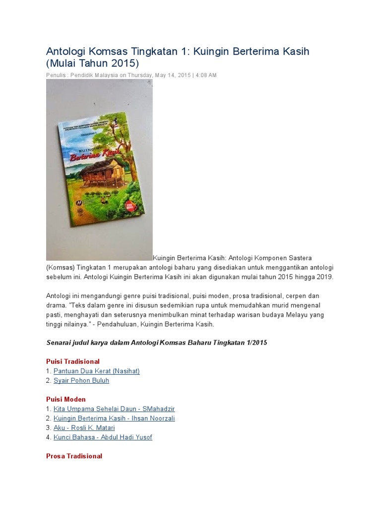 Form 1 Pantun from cdn.slidesharecdn.com Antologi kuingin berterima kasih (tingkatan 1). Di sana tiada bilik bersekat. Baca syair pohon buluh, halaman 6 dalam. Antologi tingkatan 1 kuingin berterima kasih pendeklamasi puisi tradisional direka cipta oleh myteach sdn bhd produk dalam bentuk powerpoint atm (advance teaching module) dan cetakan buku omg (oh my guru) bahasa melayu jom ikuti kami di media sosial : Secara ringkasnya, persamaan antara pantun, syair, seloka dan gurindam adalah ianya dikenali sebagai puisi melayu tradisional atau puisi lama dan klasik. Gelapnya di dalam seperti malam. Sinopsis bagi novel sejambak bakti. Posted on october 13, 2018january 10, 2019 by adenium2.