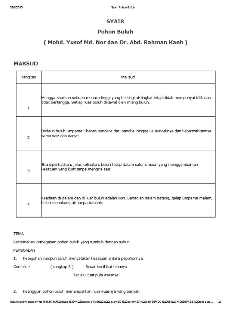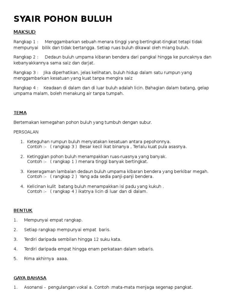 Ada 20 gudang lagu syair pohon buluh tingkatan 1 irama dodoi improv terbaru, klik salah satu untuk download lagu mudah dan cepat. Tema keistimewaan pohon buluh merupakan tema bagi syair pohon buluh yang terdapat dalam puisi tradisional tingkatan satu. Tema dan persoalan (syair tingkatan 1) →. Bab 1 kisah di kedai koperasi. 6 9 syair pohon buluh created date: ← sinopsis bab 3, 4 (novel tingkatan 3). Baca syair pohon buluh, halaman 6 dalam. Muat turun nota nota ringkas: 7 10 2015 11:47:07 am. Anggota masyarakat yang hidup bersaudara. Antologi kuingin berterima kasih (tingkatan 1). Secara ringkasnya, persamaan antara pantun, syair, seloka dan gurindam adalah ianya dikenali sebagai puisi melayu tradisional atau puisi lama dan klasik. Syair pohon buluh tingkatan 1.